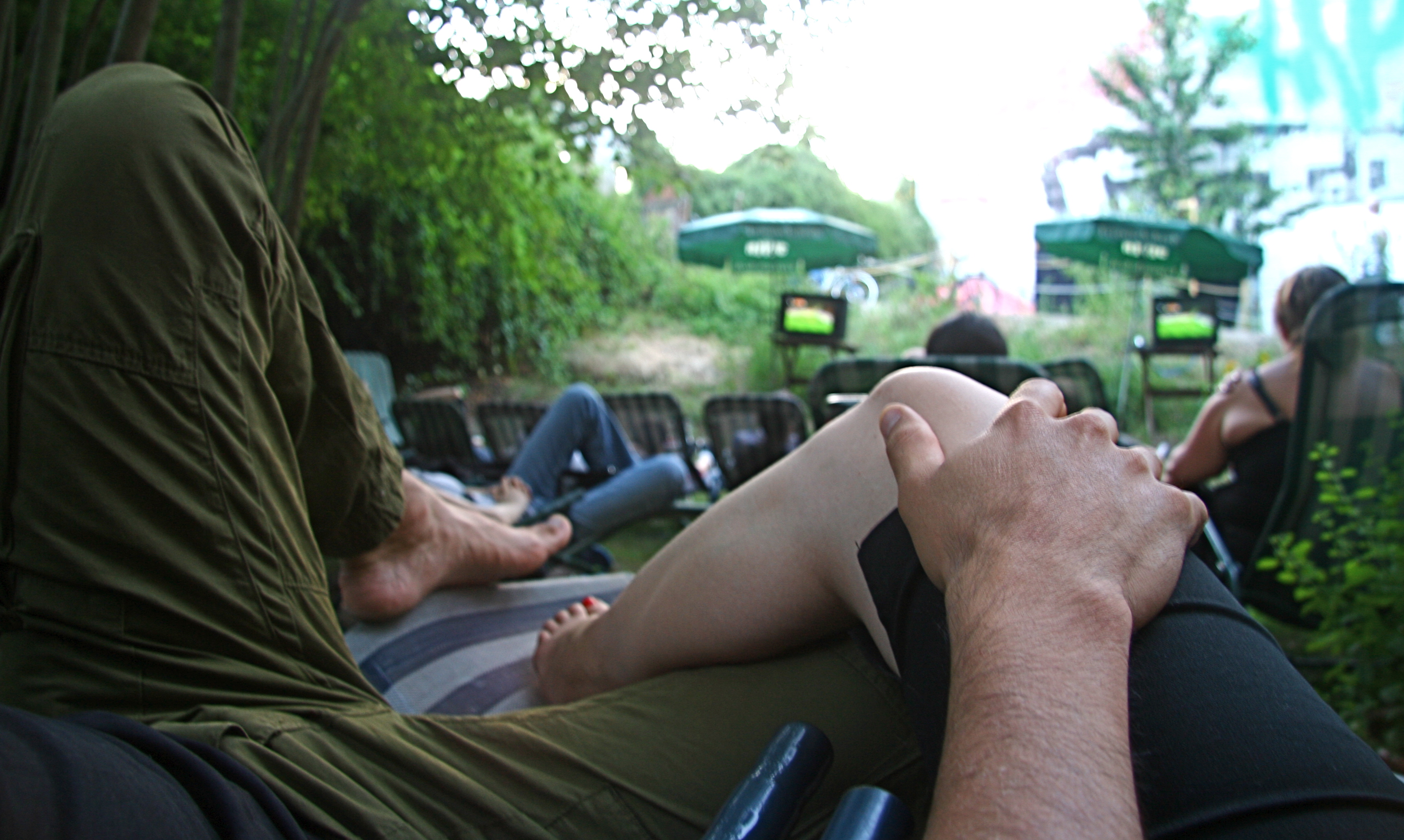 At a beer garden in Berlin, “watching” the world cup final on those tiny TVs far way (Holland vs Spain). Our first trip together.